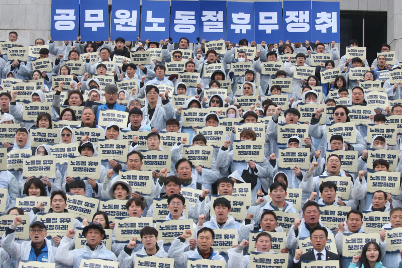 전국공무원노동조합과 대한민국공무원노동조합총연맹 관계자들이 18일 오후 국회 본관 계단 앞에서 '공무원 5.1 노동절 휴무 쟁취 기자회견'에서 노동절 휴무 보장 촉구 손피켓을 들고 구호를 외치고 있다. 2026.03.18