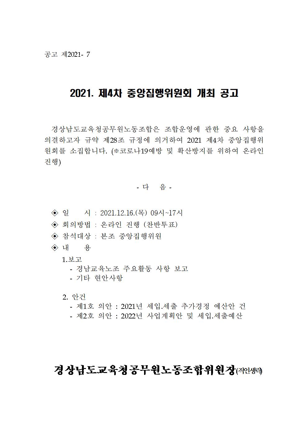 [공고 제 2021-7] 2021. 제4차 중앙집행위원회 개최 공고