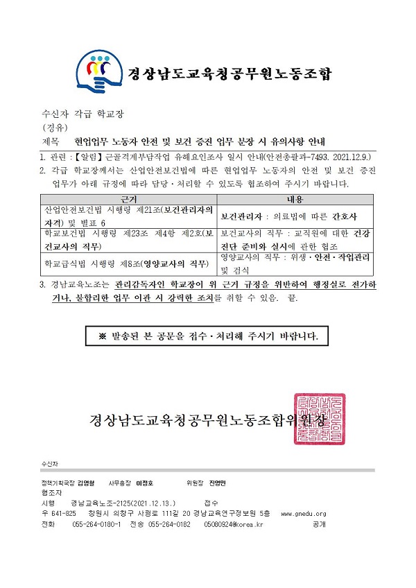 경남교육노조 공문(2125) 현업업무 노동자 안전 및 보건 증진 업무 분장 시 유의사항 안내.hwp