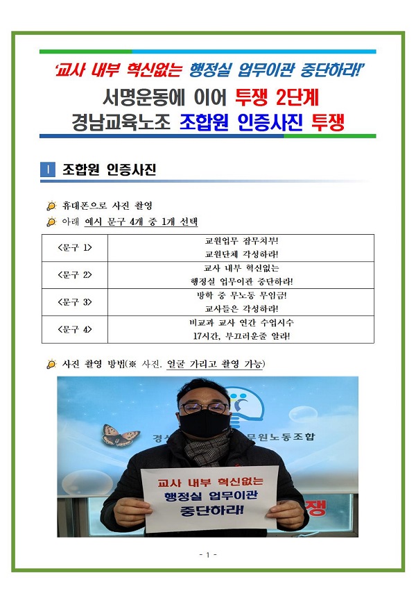 <투쟁 2단계> 조합원 인증사진 투쟁(교사 내부 혁신없는 행정실 업무이관 중단하라!)