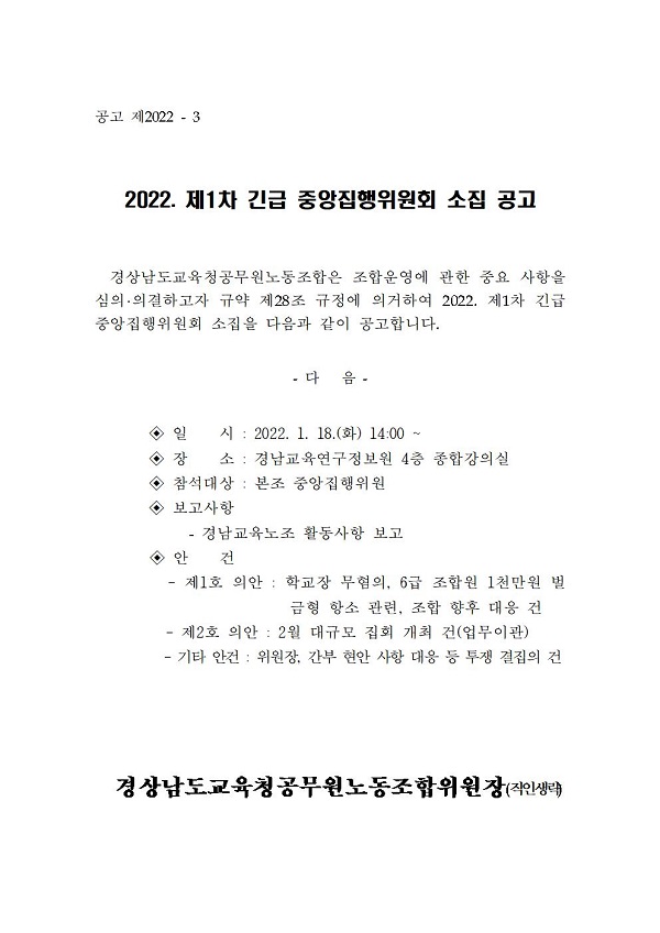 [긴급공고 제2022-3] 2022. 제1차 긴급 중앙집행위원회 소집 공고