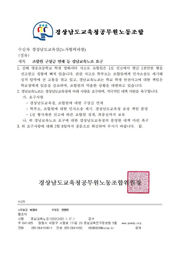 [공문] 조합원 구상금 면제 등 경남교육노조 요구