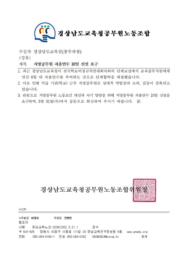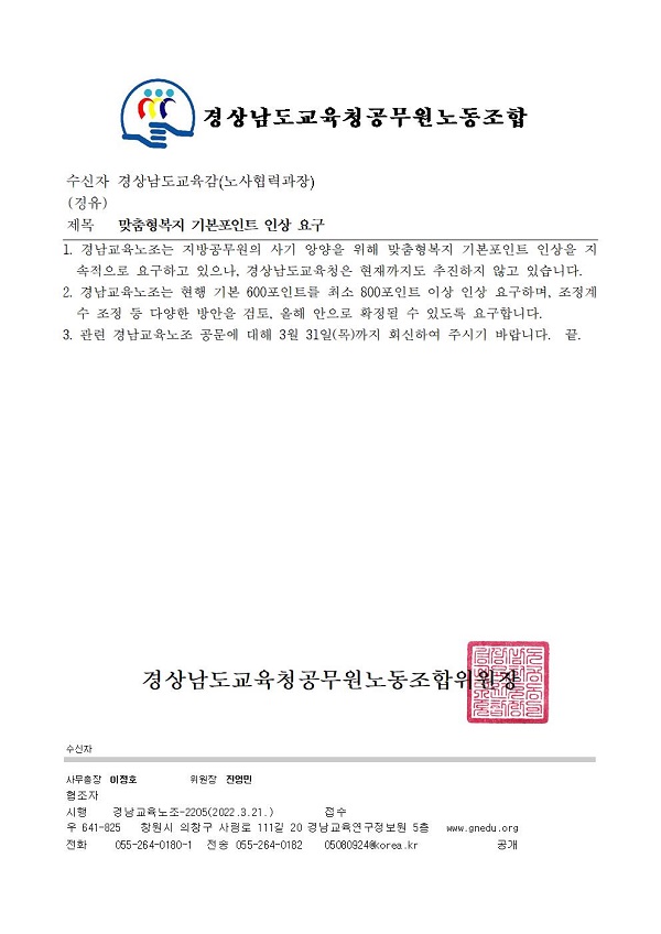 <요구 공문> 맞춤형복지 기본포인트 인상 및 지방공무원 자율연수 10일 신설 요구