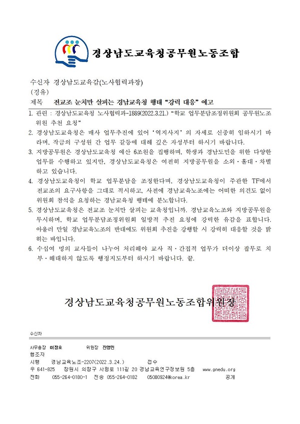 <공문> 전교조 눈치만 살피는 경남교육청 행태“강력 대응”예고