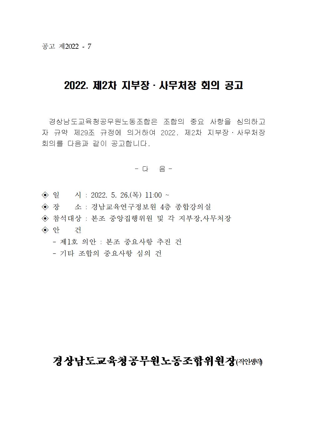 [제2022-7] 2022. 제2차 지부장·사무처장 회의 공고