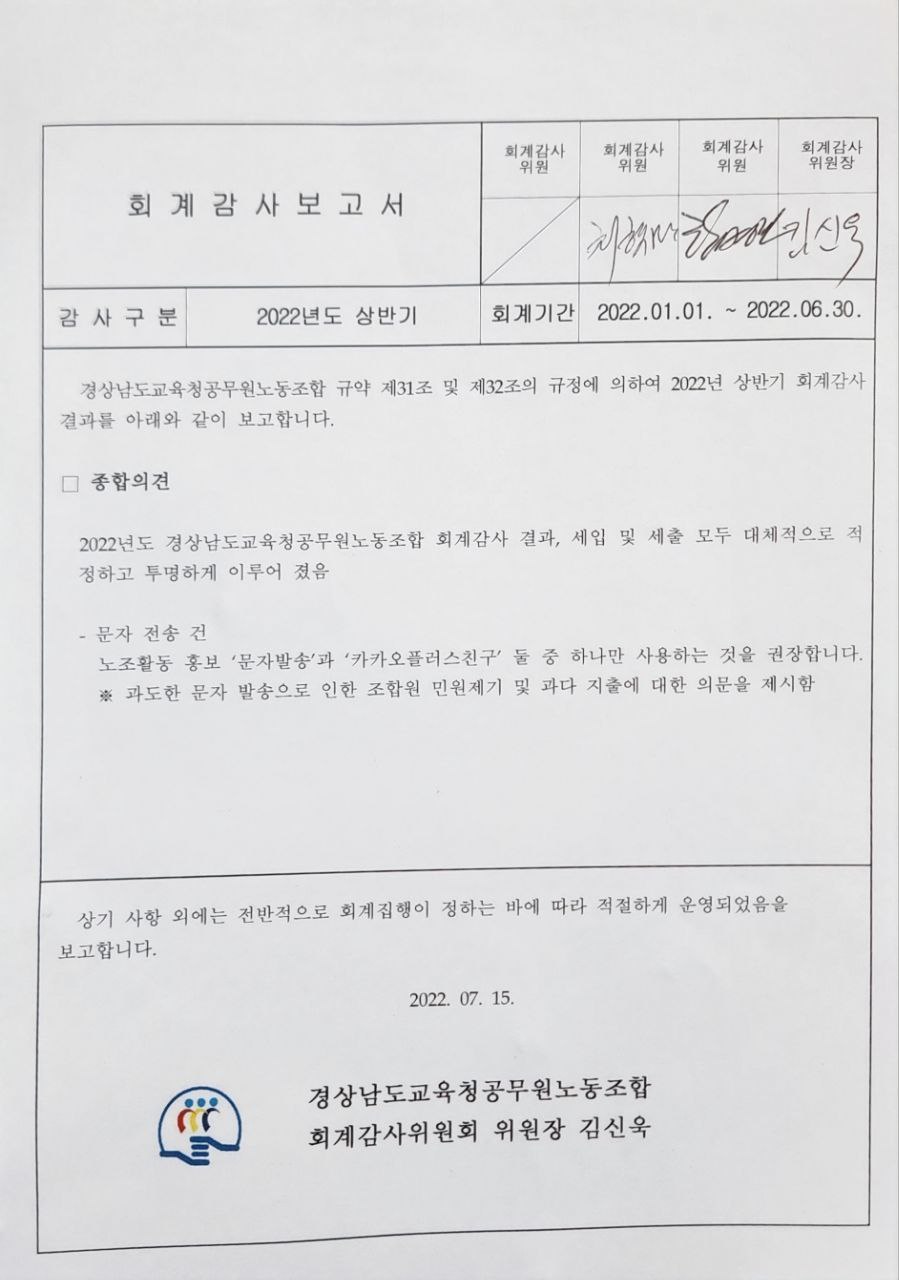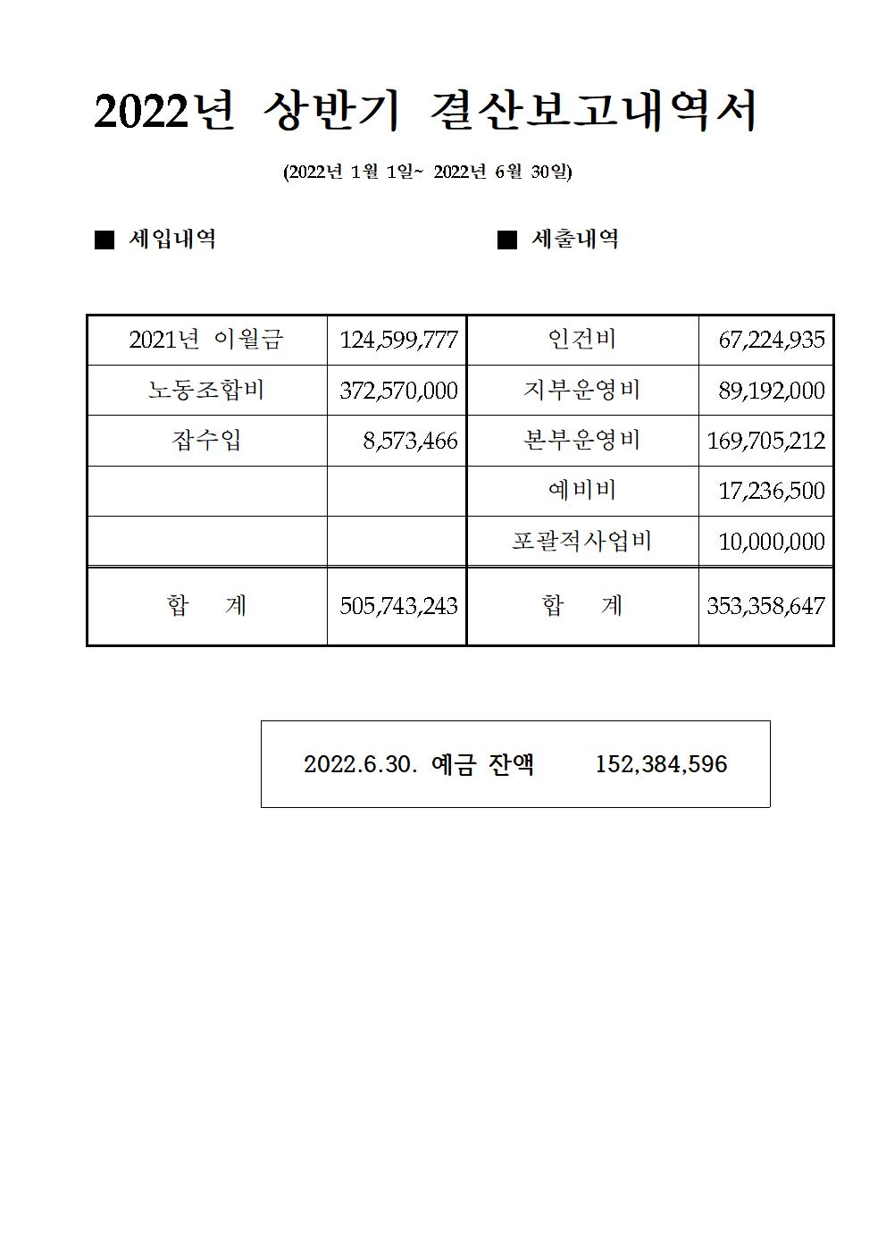 2022년 상반기 (22.1.1.~6.30.)회계결산 및 감사보고